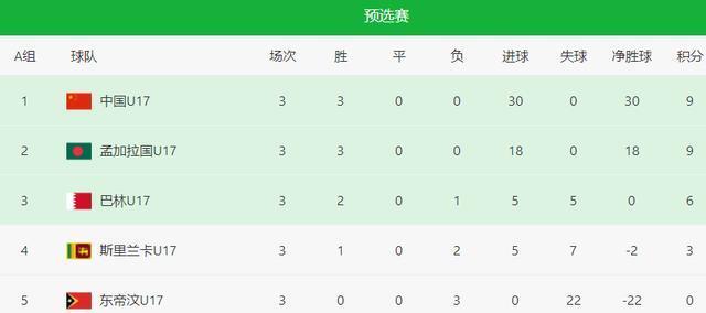 在拿下这场胜利后,U17国足已经取得了3连胜,3场比赛球队狂进了30球,目前和孟加拉国一样,保持着不丢球的纪录。当然,中国队的净胜球要比对手多了12个,所以暂时排名小组第一!