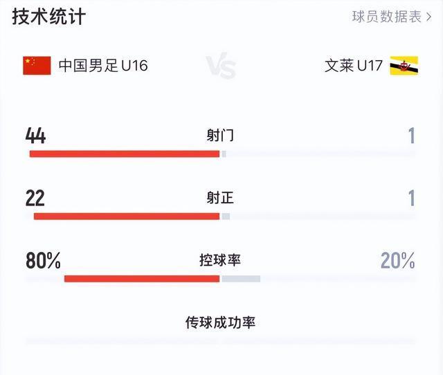 这场比赛,中国U17男足的优势依然是压倒性的,全场比赛44脚射门,有22脚射正,同时取得了12个进球,而文莱只有在下半场有1次射门!